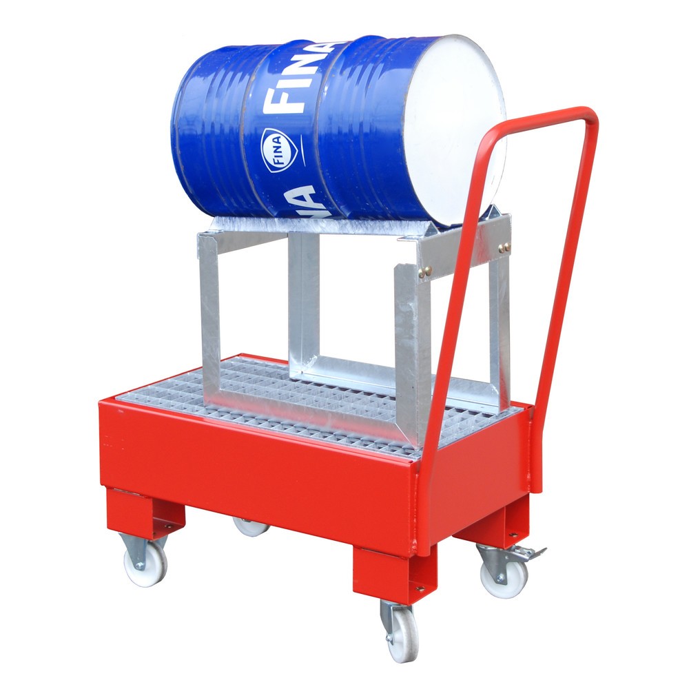 De lekbak van staal, verrijdbaar, dient om vaten van 60 en 200 liter evenals kleine verpakkingen voor waterverontreinigende of ontvlambare vloeistoffen reglementair op te slaan en af te tappen. In vuurverzinkte of gelakte uitvoering voor staand of liggend opslaan verkrijgbaar.