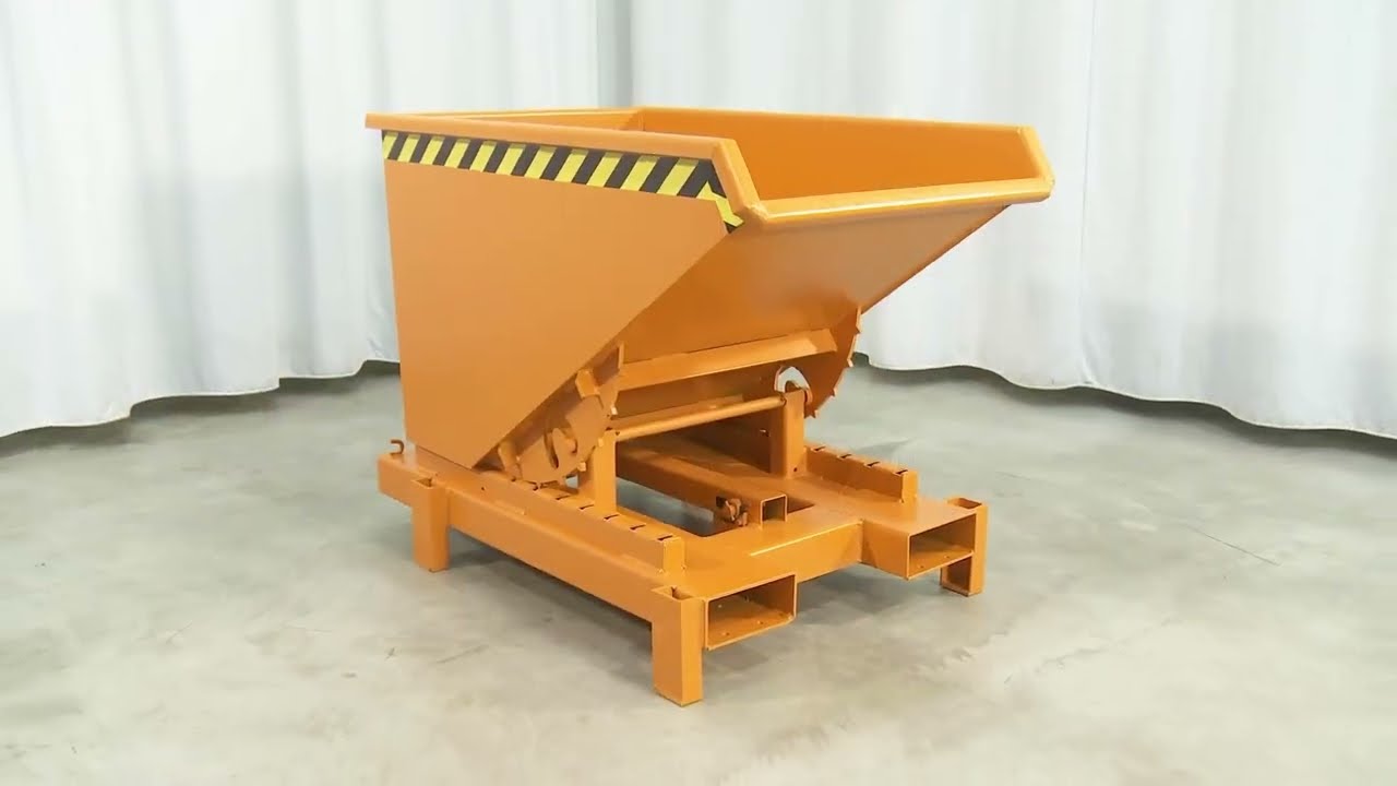 De robuuste staalconstructie met randversterking en dikke kuipplaat is voor een optimale oppervlaktebescherming naar keuze gelakt of vuurverzinkt. De inrijkokers voor de vorktanden zijn speciaal voor het transport van zware goederen doorgaand en gesloten. Als u de zwaarlastkantelbak wilt transporteren en leegmaken, neemt u hem eenvoudig - via de uiterst stabiele inrijkokers - met de heftruck op, en heft u de bak tot op de gewenste hoogte. Een kettingbeveiliging voorkomt afglijden en onbedoeld leegkiepen van de container. De ontgrendeling van de kuipbak gebeurt automatisch door de activeringsvoet op de rand van de bak te plaatsen (de activeringsvoet bevindt zich onder de vorkkoker). Hierdoor ontgrendelt u het kantelmechanisme. Speciale afrolsleuven en een gunstig lastzwaartepunt garanderen volledig lossen van de bak die bovendien veilig is voor de heftruck. De handmatige ontgrendeling van de kuipbak bedient u vanaf de heftruckstoel. Trek hiervoor gewoon aan de trekkabel. Nadat de stortgoederen uit de zwaarlastkantelbak zijn gelost, zwenkt u deze met de heftruck terug naar de uitgangspositie waar hij vast grendelt.