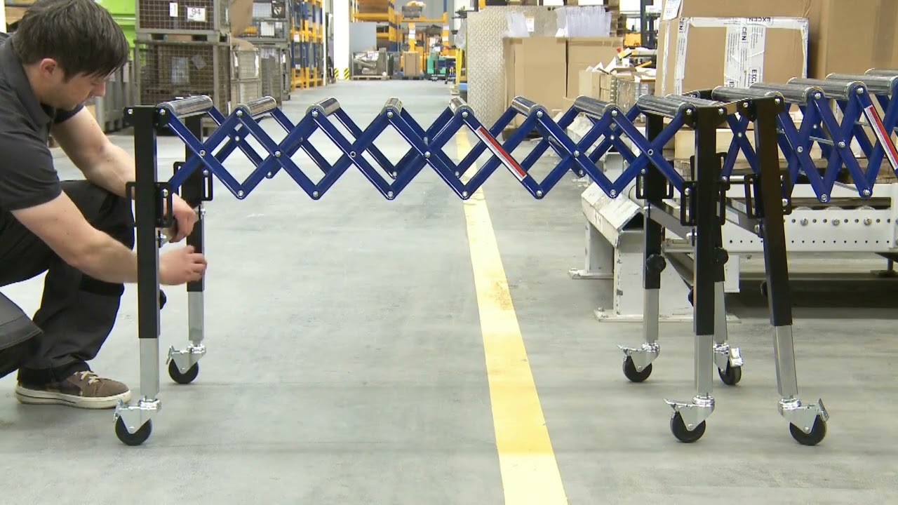 Die Scheren-Rollenbahn Ameise® dient dem schnellen Transport von leichtgewichtigem Stückgut von einer zur nächsten Arbeitsstation. Mehrere Bahnelemente lassen sich zu langen Förderstrecken verbinden, auch mit Kurven.