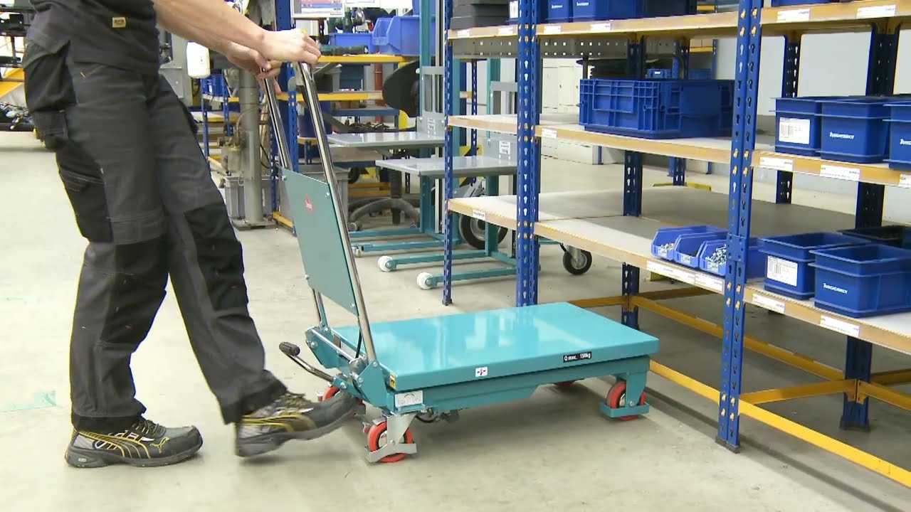 De robuuste en onderhoudsvrije verrijdbare schaarheftafel vergemakkelijkt het transport en het klaarzetten van producten en materiaal op ergonomische werkhoogte. De door een voetpedaal bedienbare hydraulische pomp maakt bediening eenvoudig en comfortabel.