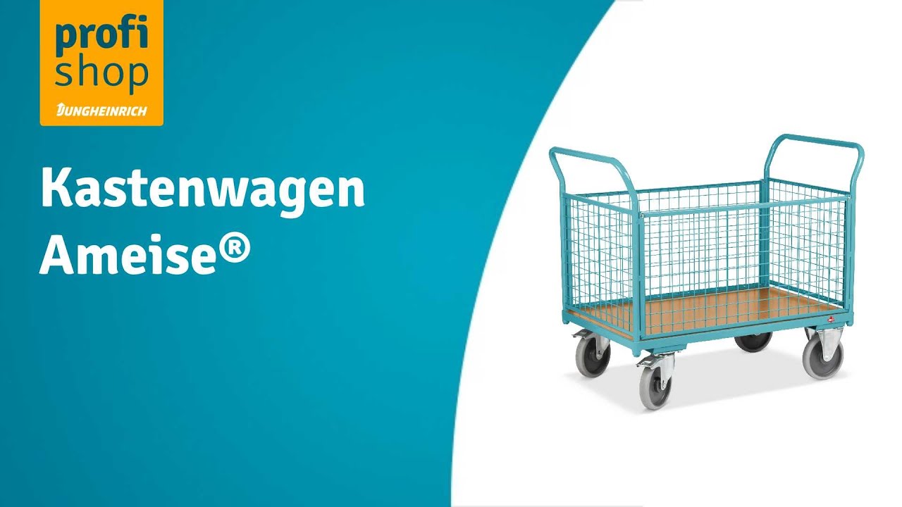 De platformwagen Ameise®, met roosterwanden aan 4 zijden is met het draagvermogen van 500 kg en gepoedercoat frame van buizenstaal geschikt voor het veilig transporteren van dozen en losse artikelen. Lichtlopende TPE-banden met kogellagers zorgen bovendien voor eenvoudig en geluidsarm verplaatsen.
